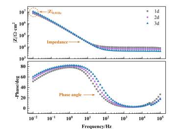 模值图:低频端的阻抗模值|Z|0.01Hz是评估防腐蚀性能的关键实用指标。它综合反映了涂层孔隙电阻和界面电荷转移电阻,其值越低,通常意味着腐蚀介质更容易到达基体并引发腐蚀。此值作为涂层性能优劣的快速评判标准。