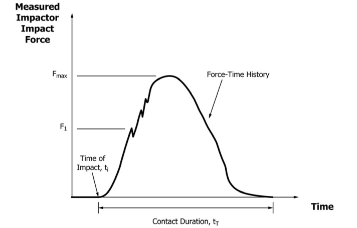 2、冲击引入:标准落锤冲击采用质量为5.5±0.25千克、冲头直径为16±0.1mm的半球形冲击器。冲击能量通常根据试样厚度进行归一化计算,标准指定冲击能量与试样厚度之比为6.7 J/mm。冲击过程会产生典型的力-时间曲线,如图1,其中峰值力(Fmax)和损伤起始力(F1:力与时间曲线斜率第一次突变对应的力)是关键参数。