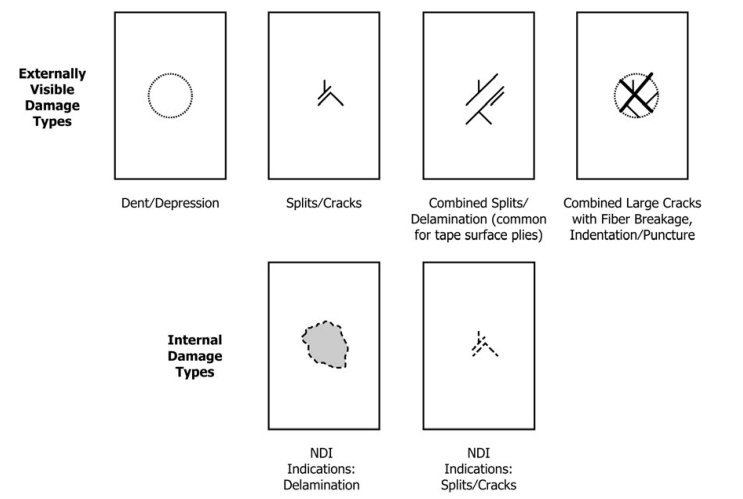 常见的损伤模式包括凹陷、分层、基体裂纹和纤维断裂,如图3