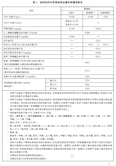 l 标准以单独表格(表2)形式,对水性地坪涂料、溶剂型地坪涂料、无溶剂型地坪涂料分别系统规定了VOC、SVOC、苯系物、多环芳烃、邻苯二甲酸酯等项目的限量值。