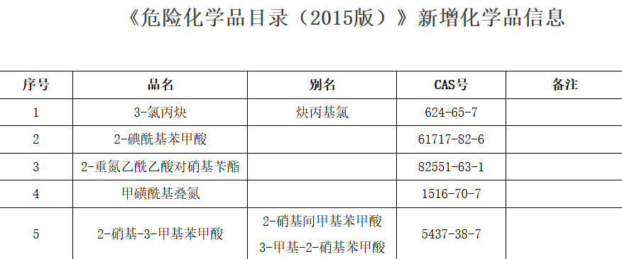 依照《危险化学品安全管理条例》有关规定,应急管理部会同工业和信息化部、公安部、生态环境部、交通运输部、农业农村部、国家卫生健康委、市场监管总局、国家铁路局、中国民航局决定,将3-氯丙炔、2-碘酰基苯甲酸、2-重氮乙酰乙酸对硝基苄酯、甲磺酰基叠氮、2-硝基-3-甲基苯甲酸等5种化学品纳入《危险化学品目录(2015版)》。应急管理部将配套补充完善《危险化学品分类信息表》。