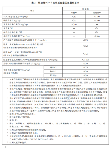 l 标准以单独章节(5.3)和表格(表3)形式,对辅助材料(如腻子、色浆、稀释剂等)的有害物质含量提出了独立的限量值要求。