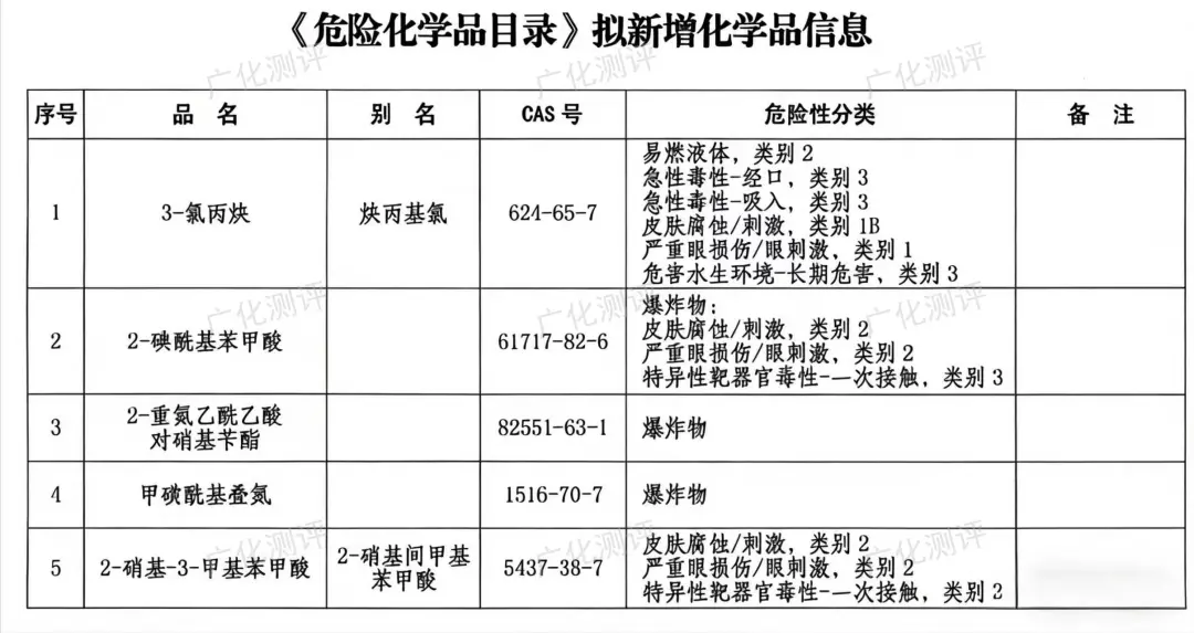 依照《危险化学品安全管理条例》有关规定,应急管理部会同工业和信息化部、公安部、生态环境部、交通运输部、农业农村部、国家卫生健康委、市场监管总局、国家铁路局、中国民航局决定,将3-氯丙炔、2-碘酰基苯甲酸、2-重氮乙酰乙酸对硝基苄酯、甲磺酰基叠氮、2-硝基-3-甲基苯甲酸等5种化学品纳入《危险化学品目录(2015版)》。应急管理部将配套补充完善《危险化学品分类信息表》。