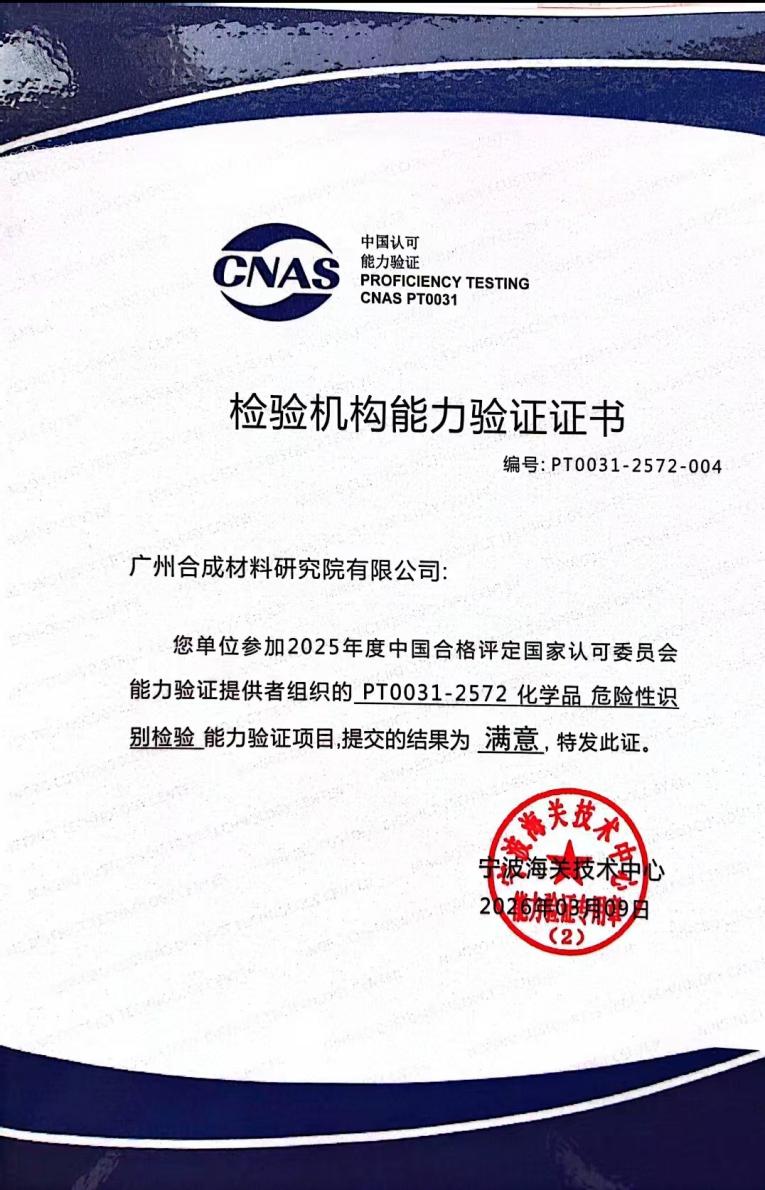 近日,广州院收到由中国合格评定国家认可委员会(CNAS)能力验证提供者颁发的《检验机构能力验证证书》,在“化学品危险性识别检验”能力验证项目中提交的结果获评“满意”,充分彰显了广州院在化学品检验检测领域的专业技术实力。